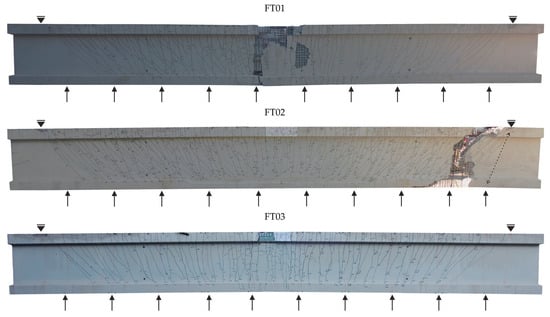 All beams were stored in statically determined manner until testing, allowing for free deformation. At an age of 2–3 weeks, vertical cracks in beams FT01 and FT02 occurred. The cracking was caused by restraint of drying shrinkage deformation due to high reinforcement ratio in the tension flange (eigen stress). FT01 cracked on a length of 2 m in the center of the beam with 11 cracks, 6 of which running from the top flange through the web and into the bottom flange with crack widths of 0.05 to 0.1 mm and a mean spacing of 12 cm. FT02 exhibited a denser crack pattern (97 cracks) in the highly reinforced tension flange with a mean spacing of 8.1 cm and a mean crack width of 0.1 mm. Seven cracks in midspan over a length of two meters ran into the web, but did not reach the compression flange. FT03 remained uncracked until testing.
