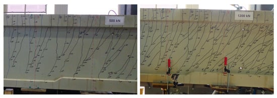Change of inclination of bending-shear cracks at 500 kN and 1200 kN total load of specimen FT02.
