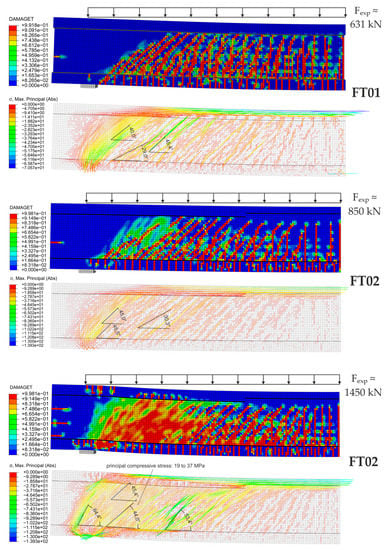 Results from FE-calculation: DamageT and principal compressive stress trajectories for FT01 and FT02.