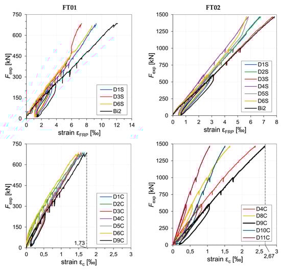 With results from strain measurements on carbon bars in the outermost layer, a comparison with the assumed strain is possible. However, it should be noted that depending on the distance to the next bending crack and the effective length of debonding, the measured strain might be slightly reduced compared to the theoretical value. Linear increase of strain in the carbon bars indicates that the internal measurement was successful. Towards the end of the test FT01, strain gauges D2S, D4S, D5S and D3S failed. Concrete strain gauges D10C and D11C in FT02 (Figure 15, bottom right) show that the compression zone reached into the web of the beam, which is in accordance with calculations.
