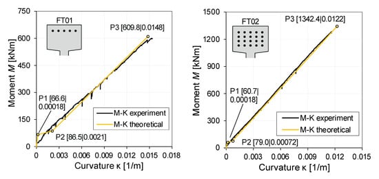 For bending design, sectional analysis with iterative variation of the linear strain distribution assuming perfect bond was utilized. As stress–strain relation for concrete in compression, the approach according to EC2 [64] was chosen. In addition to the main reinforcement, each longitudinal yarn of flange and shear reinforcement in the tension zone was considered with its respective contribution. For FT01, the failure criterion was set to reaching the ultimate strain of the main carbon bars, while for FT02 reaching the ultimate compressive strain εc1,u was decisive.