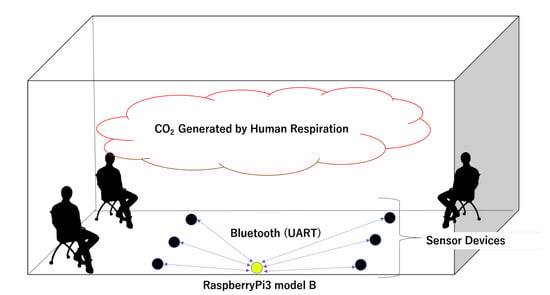 In this study, we analyzed the diffusion of CO generated by human breath by simultaneously measuring CO concentrations at multiple locations in a studio. A single measurement device can only measure locally because it measures the atmospheric CO concentration that enters the measurement section in the sensor through the nonwoven fabric. Therefore, to accurately measure the distribution of CO concentration in space, it is necessary to use multiple measurement devices to simultaneously sense CO diffusion at multiple points. Each measurement device is connected to the RaspberryPi3 via an on-board Bluetooth module and acquires data every minute. We used the Universal Asynchronous Receiver/Transmitter (UART) for serial communication between the RaspberryPi3 and the measurement device. Six measurement devices were able to be stably connected to RaspberryPI3 per one. In this study, two RaspberryPi3 were used to verify the CO diffusion. Figure 1 shows a concept diagram of the system created.