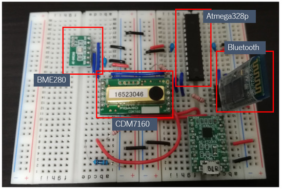 In this study, a CDM7160 CO sensor module provided by Figaro was used to measure CO concentration and a temperature sensor, BME280, was used to check the temperature change in the room. The reason for selecting the CDM7160 CO sensor module is that the data output is digital rather than analog, which is often used in conventional CO concentration sensors. The accuracy is ±50 ppm plus 3% of the output value in the range of 300 to 5000 ppm, which is higher than that of conventional sensors []. The measurement range is limited to a single point in the sensor because the CO concentration in the atmosphere that enters the measurement part of the sensor through the nonwoven fabric is measured. The accuracy of the BME280 is ±1 C in the range of −45 to 85 C. Figure 2 shows the external view of the measurement device.