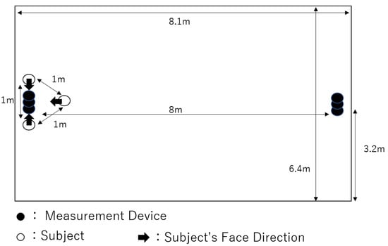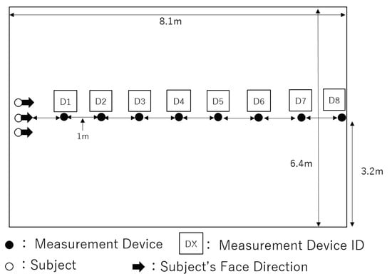 In Case 2, three subjects were placed at the edge of the room, and the measurement devices were placed at six locations at a height of 0 m (floor), 1 m and 2 m, and 1 m and 8 m away from the subjects, respectively. The arrangement of the subjects and devices in Case 2 is shown in Figure 4.