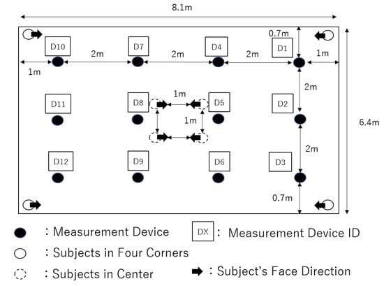 In Case 3, four subjects were placed in the four corners or the center of the room. Case 3a is the experiment in which subjects are placed in the four corners of the room, and Case 3b is the experiment in which subjects are placed in the center. The measurement devices were placed at 2 m intervals on 4 × 3 blocks to cover the room, and the distance between subjects was set to 8 m or 6.5 m when subjects were placed at the four corners. The measurement device was placed on the floor and its height was set at 0 m. The distance between subjects was set at 1 m when the subjects were placed in the center of the study. The arrangement of the subjects and devices in the experiment is shown in Figure 5.