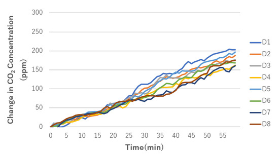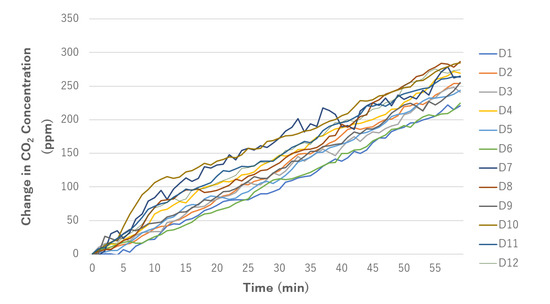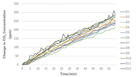 To confirm that the acquired data were correctly obtained, we compared and corrected 12 measurement devices using the IES-5000 type indoor environment measurement set developed by Shibata Kagaku Co []. We used a two-point calibration curve [] with two gases, 500 ppm and 1500 ppm, to make adjustments, and the sensor outputs of all the measurement devices were corrected to be within the error range.