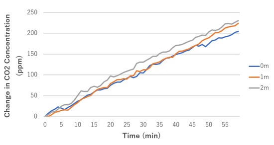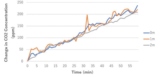 With the spread and development of the Internet of Things (IoT), highly accurate and compact sensor devices for environmental measurement have been developed and can be used in a variety of situations. These sensor devices are used not only for specific facilities, but also for measuring and adjusting the environment of places where people normally live, such as smart homes and smart offices [,]. By quantifying the state of the environment with these sensor devices, it has become possible to objectively evaluate changes in the environment that cannot be captured by human senses. However, there are many factors that should be evaluated in a person’s living environment, and it is difficult to manage all of them [], such as tobacco smoking and ambient particulate matter pollution. Therefore, it is necessary to identify and control the factors that may exist in any living environment to support people’s lives. In this study, we focus on the concentration of carbon dioxide (CO) in a room. Since CO is generated and accumulated by human activity, it is necessary to prevent a decrease in the quality of human intellectual activity due to an increase in CO concentration []. Furthermore, according to the study by U. Satish et al. [], it is considered to be “Relative to 600 ppm (parts per million), at 1000 ppm CO, moderate and statistically significant decrements occurred in six of nine scales of decision-making performance.” Thus, even concentrations as low as 1000 ppm have been shown to have an adverse effect on human decision-making. For this purpose, it is necessary to predict the change in CO concentration and control it so that the concentration in the room is below constant. In order to maintain the quality of intellectual activity in human interaction in a room, we analyze the diffusion tendency of CO in exhaled air and investigate a model to predict CO concentration. Specifically, in this study, we measured and analyzed how CO diffused in a low concentration zone, which had not been noticed until now, by simultaneous multipoint sensing. In addition, we selected a prediction model from the experimental results and compared the prediction model of CO concentration in the existing room with the measurement device in the actual room in three different sized rooms on the same basement level of the same building, and verified whether the existing prediction model is applicable to the measurement method using the measurement device.