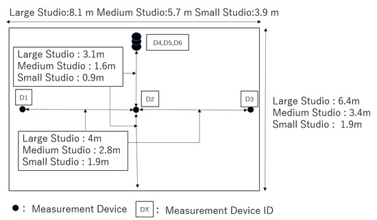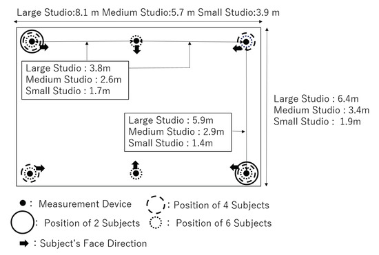 In this chapter, we compare and analyze the change in CO concentration measured by the measurement device and the change in concentration by CO concentration prediction model described in chapter 3, when the room volume and the number of subjects are different. Essentially, the prediction model for gas concentration is predicated on steady-state or instantaneous uniform diffusion, and since human exhalation is not instantaneous uniform diffusion, it does not satisfy that prerequisite. However, from the results of the experiments in Section 4, it was confirmed that the CO concentration in the room increased uniformly within the error range of the sensor under the condition of one-minute intervals. Based on these experimental results, we considered that the concentration in the room increased near the measurement point in the same way as instantaneous uniform diffusion, albeit quasi-uniformly, and applied the prediction model. In the experiment, we measured the increase of CO concentration in three rooms of different sizes (large, medium and small studios) on the same basement level in the same building, where two, four and six subjects waited for the experiment. The duration of the experiment was set at 30 min, and the volume of the studio was 197.0 m for the large studio, 48.5 m for the medium studio and 22.2 m for the small studio, with heights of 3.8 m, 2.5 m and 3 m, respectively. Six measuring devices were installed in the room, and considering the sensor error, the change of CO concentration in the room was defined as the average of four values excluding the two measuring devices with the maximum and minimum increase in the final CO concentration. The measurement device was placed on the floor and its height was set at 0 m. Figure 11 shows the arrangement of the subjects in each room and their distances.
