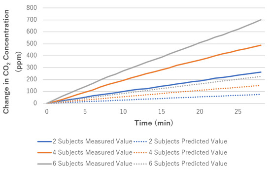 The results of changing the number of subjects in the large, medium and small studio environments are shown in the graphs from Figure 13, Figure 14 and Figure 15 along with the results of the prediction model. However, when we experimented with six subjects in the small studio, the CO concentration in the room was about to exceed 2000 ppm, and the experiment was stopped because of the effect on the health of the subjects. In all experiments, the average room temperature ranged from 19 to 22 C and did not change more than ±2 C during the experiment. For all graphs in this section, the x-axis shows the time elapsed and the y-axis shows the amount of change in CO concentration from the beginning of the experiment.