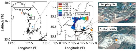 The study area is a typical suburban residential area located in the Republic of Korea. The village (35.457° N, 127.464° E) has a population of about 50 people, and there is an asphalt mix plant (35.457° N, 127.469° E, elevation 223 m, area of 35,000 m2) located about 300 m away from the residential area (Figure 1). Two integrated samplers, a low volume sampler with a flow rate of 16.7 L/min (URG-2000-30EHS/filter pack; URG-2000-30FG, Chapel Hill, NC, USA) and a high volume sampler (1013 L/min: Thermo Fisher Scientific, Waltham, MA, USA), were deployed for sample collection during the measurement period [29,30]. The nearby asphalt mix plant was established in 1995, and after the first lung cancer patient in the area was diagnosed in 1999, the National Center for Disease Control (NCDC) announced that 14 of the 50 residents of the village had been diagnosed with cancer [31,32]. Therefore, the incidence rate of cancer patients in this village is substantially higher than the national average. To identify pollutant transport into the village, a sampling site located in the center of the village, which is east of the asphalt mix plant, was selected. In total, 61 PAH samples (24 h integrated samples, every six days) were collected from December 2014 through to December 2015.