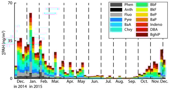 The PAHs contained in the PM2.5 were analyzed and are represented as time series concentrations in Figure 2. The results show that the ∑PAHs contained in PM2.5 ranged from a minimum of 0.51 ng/m3 to a maximum of 60.73 ng/m3, with an average of 11.54 ng/m3. Seasonal ∑PAHs were highest in winter (December–January), followed in order by spring (March–May), autumn (September–November), and summer (June–August). The higher concentrations of ∑PAHs in winter, autumn, and spring compared to summer may be due to meteorological conditions in the point source area.