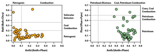 PAH cross-plots for the ratio of Anth/(Anth/Phen) vs. BaA/(BaA+Chry) and Anth/(Anth+Phen) vs. Fluo/(Fluo+Pyre).