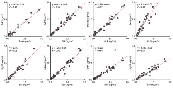 The ratio of PAHs emitted from asphalt in this study was compared with the results of previous studies. In previous studies, the ratio of Fluo/Pyre discharged from asphalt was about 1.17 and the ratio of Fluo/BeF was about 0.52 [44,45]. In contrast, in this study, the ratio of Fluo/pyre was 1.22 and the ratio of Fluo/BeF was 0.72. These ratios are similar to those found in previous studies. The characteristics of PAHs generated by the raw materials used to make asphalt and the manufacturing process are different [46,47]. However, comparing the results of this study with the results of previous studies indicates that the PAHs measured in this study were generated by asphalt. An itemized correlation analysis of the analyzed PAHs is shown in Figure 4. The correlations (r2) for BaA vs. BaP; BbF vs. BeP, Indeno, BeP, and BghiP; and BeP vs. Indeno, DbA, and BghiP were greater than 0.88 in all cases. This indicates that the emission source of the PAHs contained in PM2.5 is the same source. In addition, changes in the PM2.5 concentration did not have a significant effect on the ratio of PAH components, indicating that the concentrations of PM2.5 and PAHs were proportional to each other. Based on the OC, EC, and BC measurement results, we confirmed that the emission source for PM2.5 was the asphalt mix plant and that the concentrations of PM2.5 emitted and PAHs were proportional to each other. In conclusion, PAHs in the study area are attributable to emissions from the asphalt mix plant.
