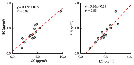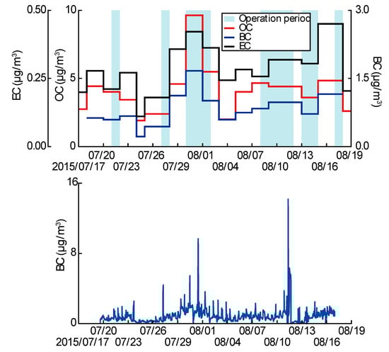 The temporal concentrations using 24 h integrated PAH samples every six days, BC (one-minute resolution), EC (72 h integrated), and OC (72 h integrated) were analyzed to characterize the PM2.5 collected from the study area. BC is emitted from a variety of combustion processes, mainly incomplete combustion [48,49,50]. On the other hand, OC is classified as primary organic carbon (POC) or secondary organic carbon (SOC) formed by photochemical reactions, depending on the formation process [51,52]. Estimations of primary and secondary particles based on the proportions of OC, EC, and BC contained in PM2.5 have been conducted in various studies [26,53]. The overall averaged BC in the intensive periods was 0.84 μg/m3. It is interesting that the maximum BC concentration reached 14.17 μg/m3 on 11 August when the asphalt mix plant was running.
