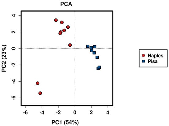 Principal Component Analysis calculated on the 16S ecological matrix at the level of order. The samples from Naples (red dots) and Pisa (blue square) show distinct clusters on the first axis that accounts for the 54% of the total variance.