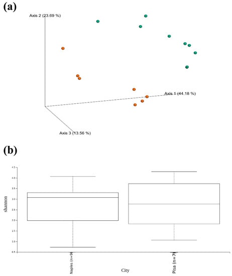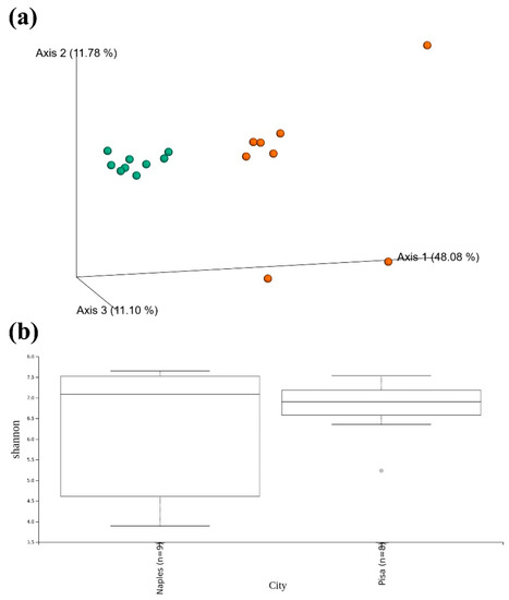 As for the 16S data, the Beta diversity index (Figure 4a) shows a difference between the fungal communities of Naples and Pisa samples. The median Shannon values, indicating Alpha diversity, are similar for the two communities (Figure 4b).