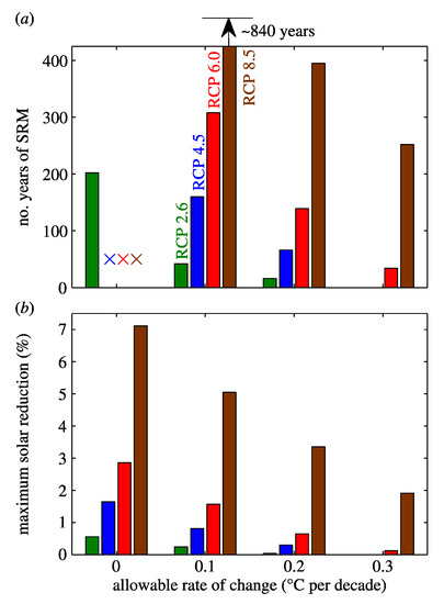 38] determine the deployment time of SAI for different RCPs. In an RCP2.6 world SAI deployment would only be necessary for 40 years. However, the time frame increases sharply beyond RCP2.6. For RCP4.5, the duration of deployment would be 160 years, culmination to roughly 800 years for RCP8.5. Such long periods of time, or so we hold, are unacceptable, because they make SAI the usual business for at least four or six generations. Governance schemes cannot be guaranteed for 160 years, not to speak of 800 years. Thus, the risk of a sudden and, perhaps, involuntary termination remains, which clearly should not occur [