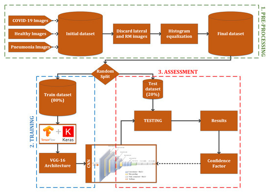 - Assessment: after the model is obtained, the testing dataset is used to evaluate the classification effectiveness, obtaining a confidence factor. This one is used to analyze the CNN performance in order to evaluate the usefulness as a diagnostic tool.