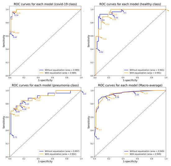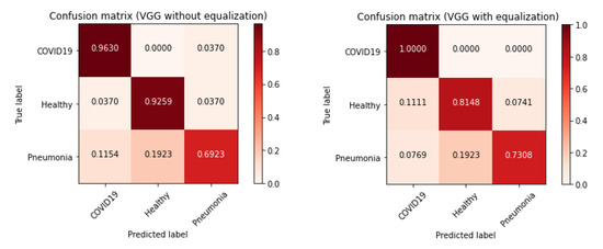 - Pre-processing: the images stored in the original dataset contains lung X-ray images of healthy patients, patients with pneumonia and COVID-19 positives. However, some images of the COVID-19 positive cases were not obtained with the same parameters as detailed above, so these images must not be taken into account. Moreover, in order to work with images of the same characteristics, an histogram equalization is applied. These two treatments compose the pre-processing stage. The results of the pre-processing step can be observed in Figure 2.