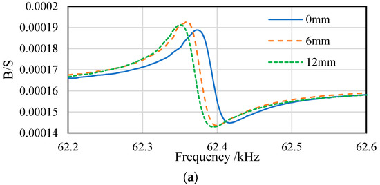 The detailed frequency bands of 19.2–19.3, 62.5–63 and 174.5–175 kHz, covering from relatively low to relatively high frequencies, are chosen as scanning frequency bands for the finite element harmonic response analysis. Then the piezoelectric impedance is computed. The piezoelectric admittance spectra and peak frequencies in the admittance spectrum with different cracks lengths (0 mm crack length means primitive state) on the beam are shown from Figure 4, Figure 5 and Figure 6, the vertical coordinate is an imaginary part of the piezoelectric admittance spectrum, whose unit is siemens (S).