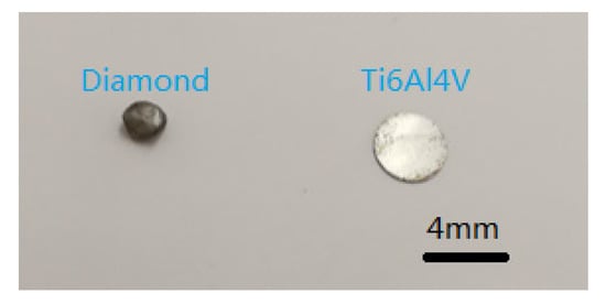 In this work, thermal analysis experiments were carried out using a TGA1600 simultaneous thermal analyzer with two functions, including differential thermal analysis (DTA) and thermal gravimetric (TG). The samples that consisted of diamond and Ti–6Al–4V were heated in a designated temperature range, as shown in Figure 1. The heating range was 293 K to 1473 K, and the heating rate was set to 10 K/min. Moreover, argon or air continuously penetrated into the crucible with a flow rate of 40 mL/min during the heating process. The diameter and thickness of Ti–6Al–4V sheet were 4 mm and 2 mm, respectively.