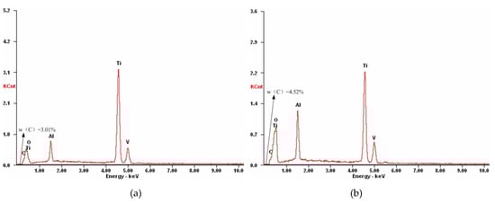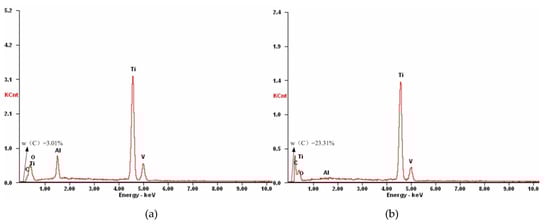 Figure 4 shows the EDS diagram of the titanium alloy sheet in the thermal analysis experiment in the air. It can be obtained from Figure 4 that the original carbon content of the titanium alloy sample before the test was 3.01%, and it increased to 4.52% on the corrosion surface after the experiment. This indicated that a slight diffusion activity of carbon atoms from the diamond crystal into the titanium alloy sample occurs during the heating process. Due to the presence of oxygen in the air, both the carbon atoms in the diamond and titanium atoms in the titanium alloy sample reacted with oxygen, which in turn, caused a certain influence on the diffusion reaction. In the air, the increase in the carbon content of the titanium alloy sample on the corrosion surface in the thermal analysis experiment was not large.