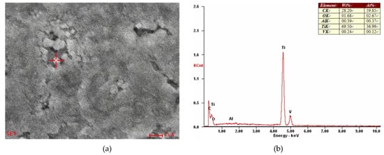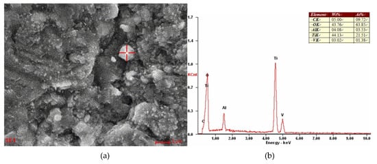 Micromorphology and EDS analysis of surface of titanium alloy after heated in argon. (a) Micromorphology; (b) EDS analysis.