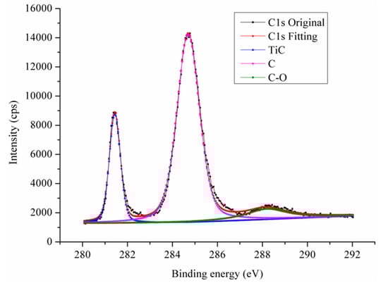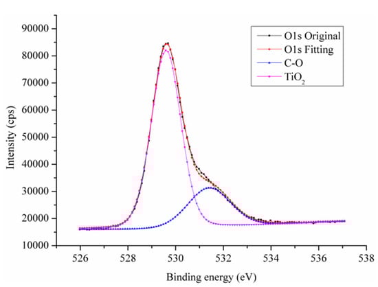 Figure 8 is an electron spectrum of the characteristic peak of O1s obtained by XPS analysis of the reaction surface of the titanium alloy sheet after hot corrosion reaction with diamond particles in air. It can be inferred from the coincidence degree of the original line of O1s and the fitted line in Figure 8 that the two lines obtained by peaking the peak value of the XPS spectrum are reasonable, and the binding energy of the two peaks correspond to 529.6 eV and 531.4 eV, respectively. Which correspond to the TiO2 and C–O bond lines, respectively.