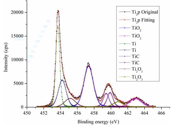 Figure 6 shows an electron spectrum of the characteristic peak of Ti2p obtained by XPS analysis of the reaction surface between the titanium alloy sheet and diamond particles in argon after hot corrosion reaction. According to the original line of Ti2p in Figure 5, spin splitting of Ti2p level orbital produces two peaks of Ti2p1/2 and Ti2p3/2. Therefore, each compound of Ti or Ti elemental should also have two peaks. The coincidence of the original line of Ti2p and the fitted line in Figure 6 shows that the spectrum obtained by peaking the peak value of XPS is reasonable, and the combined energy of the eight peaks is 453.7 eV, 454.4 eV, 455.2 eV, 457.3 eV, 459.4 eV, 460.1 eV, 460.9 eV and 463 eV, respectively. Referring to the relevant data, it can be inferred that they correspond to Ti, TiC, Ti2O3, TiO2, Ti, TiC, Ti2O3 and TiO2, respectively. This also proves that carbon atoms react with titanium atoms to form TiC, which causes chemical wear of diamond.