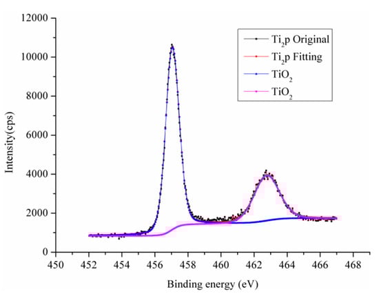 Figure 9 is an electronic spectrum of the characteristic peak of O1s obtained by XPS analysis. It is known from the original line of Ti2p that spin splitting of the 2p level orbital of Ti produces two peaks of Ti2p1/2 and Ti2p3/2. From the coincidence degree of the original line of Ti2p and the fitted line in Figure 9, it is known that the peak obtained by peaking the peak value of XPS spectrum is reasonable, and the combined energy of the two peaks is 457.3 eV and 463 eV, both corresponding to TiO2. The intensity of the peak corresponds to the content of the reaction product on the corrosion interface of the titanium alloy.