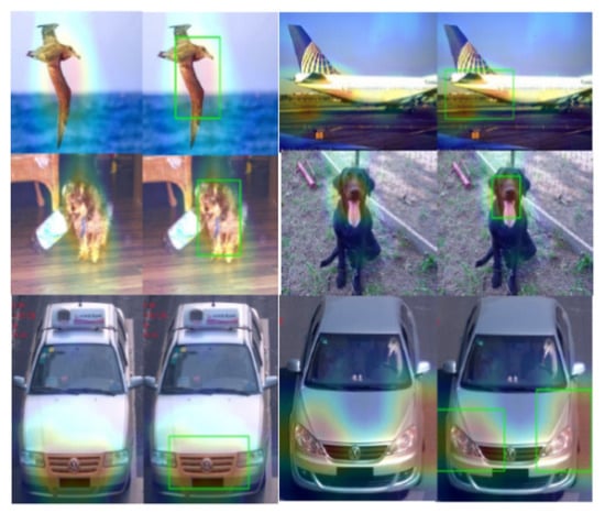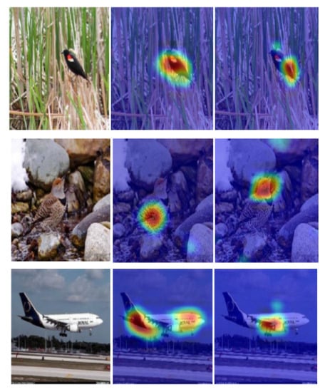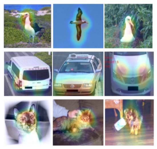Our model uses bilinear CNN to extract features. Then, a weighted gradient-based algorithm for class activation mapping is applied on the resulting features. This process is inspired by the process used in the Grad-CAM model, which was proposed by Selvaraju et al. []. This process enables our model to eliminate the influence brought by varying structures of convolutional neural networks. Additionally, it grants our model the ability to generate visually interpretable feature maps. It also makes our model capable of giving a score to a specific label when only one image and the target labels are fed into our bilinear CNN model without training from the ground up or changing the original CNN model’s structure. The score of the labels is obtained through the calculation of specific tasks. For all labels, except the required, the labels’ gradients are set to 1; the rest of the gradients are set to 0, and then the gradient is propagated back to the entire convolutional feature map. All feature maps are combined by a precise method for obtaining heat maps of the given image. The resulting heat map reveals the part that needs to pay more attention. Finally, we apply element-wise multiplication to the heatmap and the directed backpropagation, using bilinear interpolation to up-sample the input image’s resolution. Then, we merge the backpropagation results and visualization results to obtain saliency maps, which are shown in Figure 3.