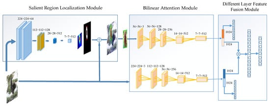 The attention mechanism has the ability to pay attention to certain content while ignoring other content. The ITTI model introduced the attention mechanism for the first time, where it was used for saliency detection []. Dzmitry employed a single-layer attention model to solve the problem of machine translation []. The inception series expanded the width of the CNNs to achieve adaptability to different convolutional scales [,,]. Xiao et al. made an initial attempt at introducing a weakly supervised method to fine-grained image classification []. The two-level attention module they proposed is capable of casting attention on two different level features, which is similar to the object-level and part-level feature of the strongly supervised learning method. The bilinear CNN (B-CNN) model was proposed by Lin et al. for the reduction of redundancy caused by the candidate region extraction algorithm []. Similar to the two-level attention model, our model is built based on the bilinear convolutional neural network.