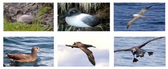 The CUB-200-2001 dataset, a few sample images of which are illustrated in Figure 6, has been extensively used in the research of fine-grained image classification []. The CUB-200-2001 dataset contains 11,788 images of birds, with 200 types of birds in general. Each has a different posture, which results in large intra-class variance and small inter-class variance. Differences between classes are normally small and regional, such as the beak, the color of the wings, or another regional area. The dataset not only provides classification labels for all bird image data but also provides essential part annotations. However, our method only uses a weakly supervised method, so only image label data was used in the model for training and testing. We used 70% of the data as a training set and 30% for testing.