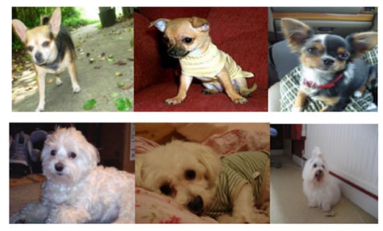 The Stanford Dogs dataset provides images of data for 120 different types of dogs []. There are 20,580 images in total, including different perspectives and poses. Only target frame information is provided, and key point information is excluded. The sample image data are presented in Figure 7. In the figure, two distinct dog breeds are shown. From the analysis of the pictures, the backgrounds of such a dataset are complicated, as some backgrounds are set on sofa, grass, etc. Hence, when we used the Stanford Dogs dataset, in the data pre-processing stage, we cropped images according to the provided label box to reduce the impact of the responsible background. Moreover, dogs of different breeds in this type of dataset have large intra-class differences. We used 70% of the data as a training set and 30% for testing.