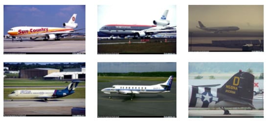 The FGVC-Aircraft provides image data of 102 categories of aircraft []. Each category has more than 100 diverse images. There are 10,200 images in total, and only label box information provided. Sample images are presented in Figure 8. We also applied image cropping to such a kind of dataset during our data pre-processing stage. We cropped the image according to the label box to reduce the impact of the background. We used 80% of the data as a training set and 20% for testing.