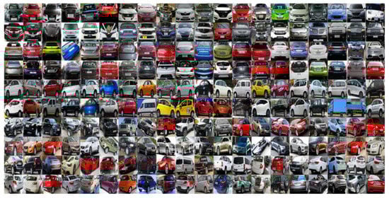 We used a subset of the CompCars dataset, which was proposed by Yang et al. [], and contains 300,000 images of 500 categories of vehicles. We used 15 categories of vehicle type, 55 categories of vehicle brands, and 250 types of vehicle models. Each type of vehicle has approximately 300 images, covering rainy days, nights, foggy days, and different angles of view. We used 70% of the data as a training set and 30% for testing. The visualization of the CompCars dataset is shown in Figure 9.