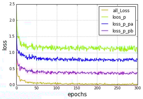 To confirm the validity of the loss functions, we designed the comparative experiment using the CUB-200-2001 dataset and compared the changes of the loss values of the functions when the number of iterations increased. The experimental results are shown in Figure 10, where the behavior of the different loss function is reported. The green curve refers to only the first term  of the mixed loss function proposed in this paper. The blue curve represents the addition of the auxiliary function  to the upper-layer network. It can adjust the upper-layer network to make it more focused on the regional feature information while enabling the model to converge faster and lower the overall loss value. The pink curve indicates the addition of the auxiliary classifier term  in the lower-layer network, which allows the lower-layer network to adjust its extracted global features. Since the global features extracted by the lower-layer network have more abundant characteristic information than the regional features, the loss value is decreased more, and the classification accuracy is increased. The remaining curve, the orange one, is the variation curve of the mixed loss function proposed by this paper. The loss value of the model in the training process is close to 0. At the same time, in this curve, we can see a significant downward trend in the loss values and a significant increase in the rate of convergence. In addition to adding two auxiliary classifiers, the central loss function is added to reduce the intra-class variance and increase the inter-class variance. Additionally, the results in Table 1 show that the accuracy of the identification can be effectively improved.