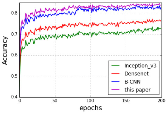 For the bilinear model, we used B-CNN proposed by Lin et al. []. The experimental results are shown in Figure 11. Although the single network structure can improve the accuracy of image classification to some extent when increasing the depth of the network, its performance is still weaker than the bilinear model. Hence, we can derive the conclusion that the bilinear deep neural network can make better use of the relationship between regional features and global features. At the same time, our method runs with only 5M parameters, while achieving a classification speed of 48 frames per second. From the derived experimental results, our proposed method obtained a better performance than B-CNN, reaching a classification accuracy of 85.1%.
