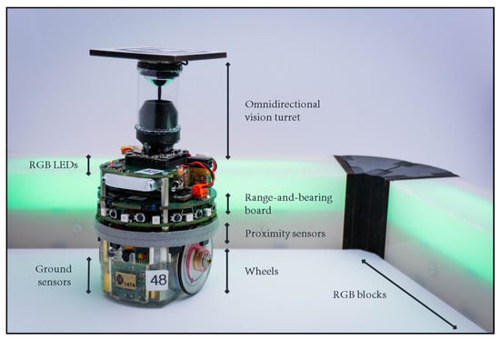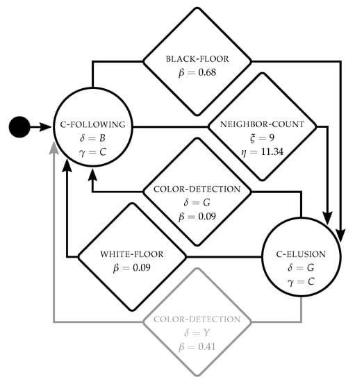 Designers of robot swarms commonly use color lights to represent specific information that robots in the swarm must identify, process and/or transmit—the nature of the information varies from one study to another and is used ad hoc to obtain a particular behavior. For example, Nouyan et al. [] designed a swarm that connects locations by establishing a chain of robots that act as waypoints for their peers. They conducted two experiments in which robots use colors differently: in the first experiment, robots repeat a pattern of 3 colors along the chain to indicate the sense in which the peers should move; in the second one, robots use colors to inform their peers about a location of interest. Mathews et al. [] designed a swarm in which robots self-organize in mergeable structures. In their experiments, robots react to colored objects in their environment and display color signals that indicate their location. Garattoni and Birattari [] designed a robot swarm that autonomously identifies and perform sequences of tasks. In their experiments, robots emit color signals to coordinate their collective action and associate each task in a sequence with objects that display a particular color. In a more general sense, one can find a similar approach in swarms that exhibit self-assembly and morphogenesis [,,,], collective fault detection [,], collective exploration [,,,], collective transport [,], coordinated motion [,,], human-swarm interaction [,], chain formation [,,], group size regulation [], task allocation [,,,,], object clustering [,], and foraging []—according to the taxonomy proposed by Brambilla et al. []. In these studies [,,,,,,,,,,,,,,,,,,,], designers manually established ad hoc relationships between the colors that a robot can perceive and the corresponding behavior that a robot must adopt when it perceives them. The research question we address in the present paper is whether automatic design methods [,] can establish similar relationships.