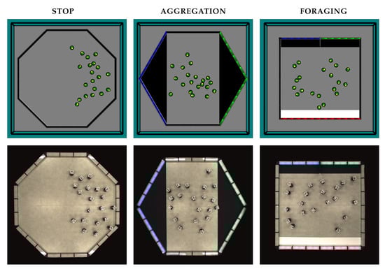 The robots must aggregate in the left black region of the arena as soon as possible. The swarm operates in a hexagonal arena of about 2.60 m2 and gray floor. Triangular black regions of about 0.45 m2 are located at the left and right side of the arena. The walls lining the left black region are blue and those lining the right black region are green—the colors do not change during the mission. Each black region is characterized by the color of the walls that lines it. That is, the blue zone refers to the black region lined by blue walls and the green zone refers to the black region lined by green walls. At the beginning of each run, the robots are randomly positioned in the center of the arena—between the black regions. Figure 2 (center) shows the arena for aggregation.