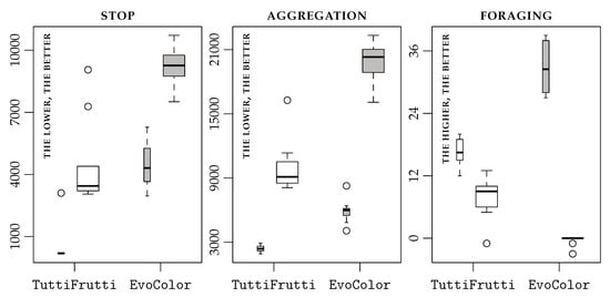 Figure 3 (center) shows the performance of TuttiFrutti and EvoColor in aggregation. In this mission, TuttiFrutti performs significantly better than EvoColor.