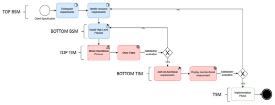 - TOP BSM: This step aims to clarify conceptually with the client functional and non-functional requirements from the specification needs to provide a better understanding of the goals to be reached. This is followed by the identification of resource requirements to accomplish these objectives using grid evaluation, as explained in Section 3.2.1. The business analyst, as well as any other analysts (IT and other sectors) involved in the study system are included, as gathering information and reaching agreements are collaborative tasks.