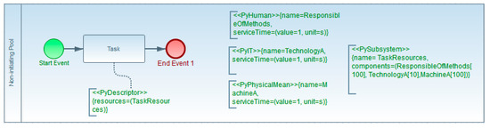 - The specification that a BPMN task uses the PySubsystem named “TaskResources” is realized through a text annotation associated to the task in the model with the following definition:<<PyDescriptor>> {resources = (TaskResources)}