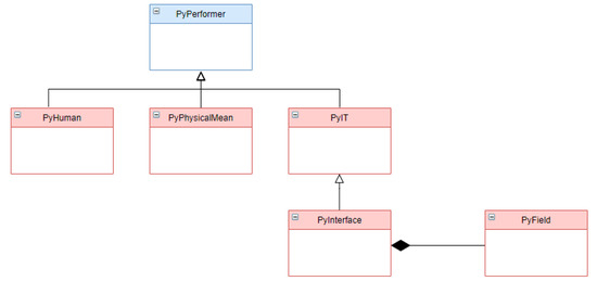 - The PyBaseResource class represents the resources and is specialized in PyPerformer, PySubSystem, and PyBroker;