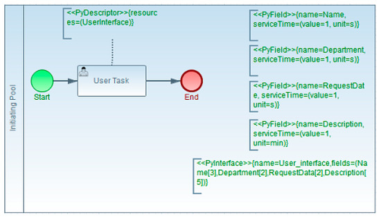 - The specification that a BPMN user task, uses the PyInterface named “UserInterface” is realized through a text annotation associated to the task in the model:<<PyDescriptor>>{resources = (User_Interface)}
