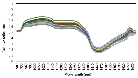 The tomato leaf ROI was 15 × 15 pixels (225 pixels) and it was selected from the tip of each terminal leaflet. For each sample, the spectral data were calculated using the average ROI of the spectral data. The relative reflectance (Figure 4) and the standardized spectrum of the tomato leaf were calculated for each leaf sample by using Formulas (3) and (4), respectively [10].