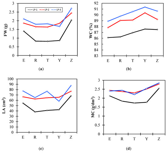 For the different tomato cultivars (Figure 5), “DR03-103” shows a higher leaf FW and leaf area than the other tomato cultivars. Differences in WC are observed among the different cultivars. The highest leaf WC is observed in the typical Japanese cultivar “CF Momotarou”, with a 3.77% difference between LP-3 (87.58%) and LP-1 (91.35%). The lowest leaf WC is observed in the Dutch “Endeavour” tomato cultivar, with a difference of 2.80% between LP-3 (86.12%) and LP-1 (88.92%). The equivalent water thickness (MC) shows almost the same value in LP-2 and LP-3, whereas the WC in the LP-3 leaf is on average 1.13% higher than the WC in the LP-2 leaf. This difference is considered to be due to the influence of the water potential, which may depend on the height difference of the leaf position.