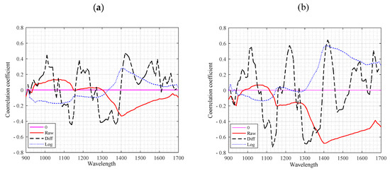 Correlation coefficient between the leaf water status and individual wavelength. (a) Leaf WC; (b) equivalent water thickness (g/dm2). RAW: raw relative reflectance; DIFF: first derivative of relative reflectance; LOG: inverse-logarithm relative reflectance (1og(1/R)).