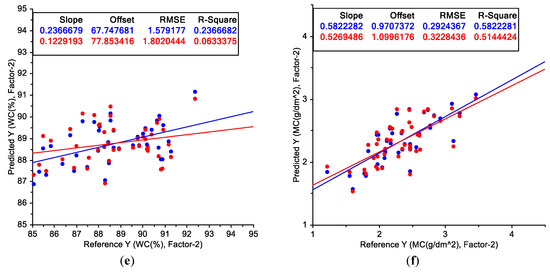 PLS regression for wavelength and water status. (a) RAW and WC; (b) RAW and MC; (c) LOG and WC; (d) LOG and MC; (e) DIFF and WC; (f) DIFF and MC. RMSE: root mean squared error. R-Square: coefficient of determination (blue denotes the calibration and red represents the validation).