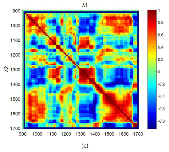 where is the wavelength of Band 1, from 900 nm to 1700 nm, and denotes the wavelength of Band 2, from 900 nm to 1700 nm. In the wavelength range from 900 nm to 1700 nm, 81 bands were identified by the 10 nm spectral resolution. All 6561 combinations of with were calculated for NDVI and TBI modeling by using MATLAB. Autocorrelation analysis was employed to improve the model accuracy and ensure model stability.